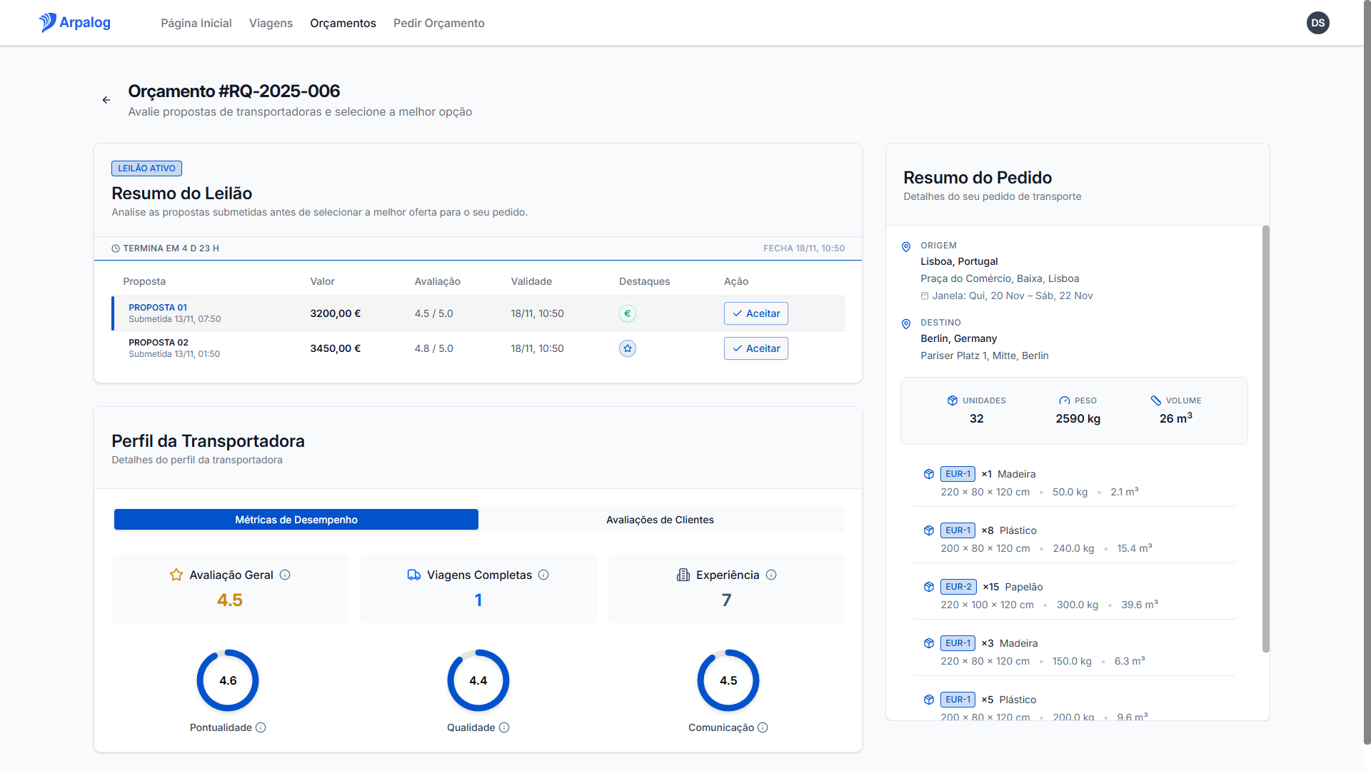 Em vez de negociar individualmente, lançe um único pedido e receba propostas competitivas de dezenas de transportadoras em simultâneo.